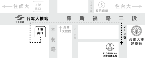 捷運台電大樓站 1 號出口,過馬路後沿羅斯福路往耕莘文教院方向前行,至台電大樓前的巷口右轉即可。