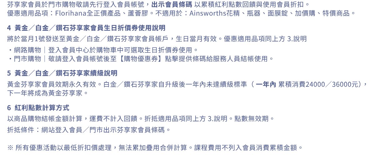 紅利點數折抵適用商品:Florihana全正價產品、蘆薈膠。