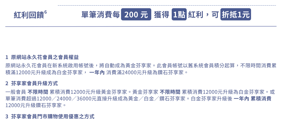 不限時間累積消費達 12,000 元,升級為黃金芬享家會員,黃金會員效期永久有效。