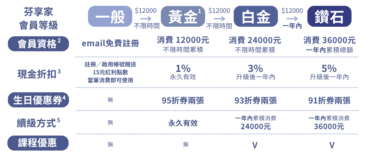 不限時間累積消費達 24,000 元,升級為白金芬享家會員,會員效期一年。一年內累積消費未達 24,000 元,下一會員年度將成為黃金會員。若白金會員一年內累積消費達 36,000 元,則升級為鑽石會員,會員效期一年。