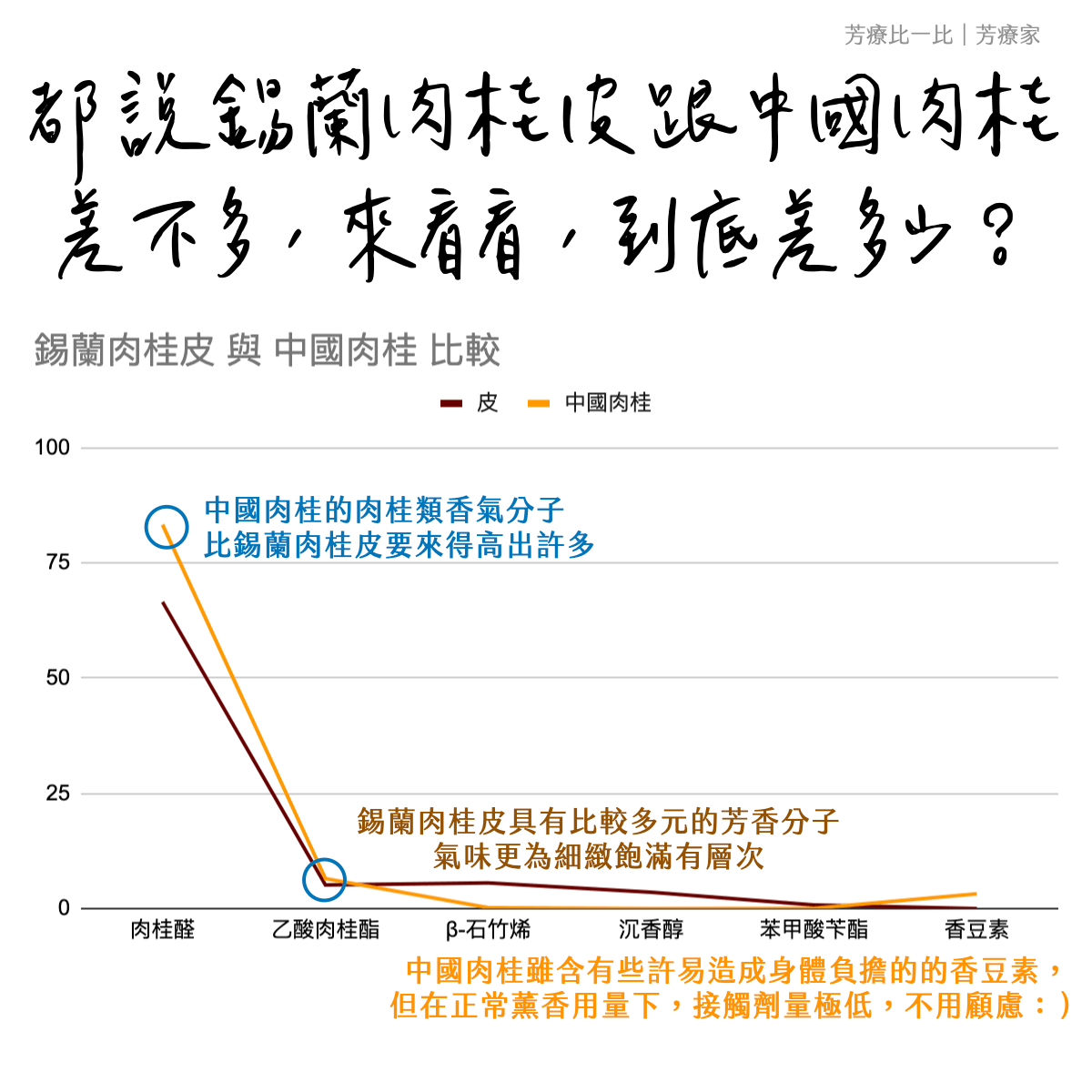 肉桂皮是包圍植物木質的部位,如果希望有被溫暖圍繞的感覺時,肉桂皮會帶來很好的幫助。印象中咖啡與甜點使用的肉桂粉,就是肉桂皮的氣味,另外一個肉桂枝的香氣則比較像丁香,枝是植物往外生長的部位,肉桂枝香氣相比起來較為清爽透利,如果有想驅散鬱寒的時候,可以考慮肉桂枝。或者以氣味偏好來挑選適合的香氣即可:)