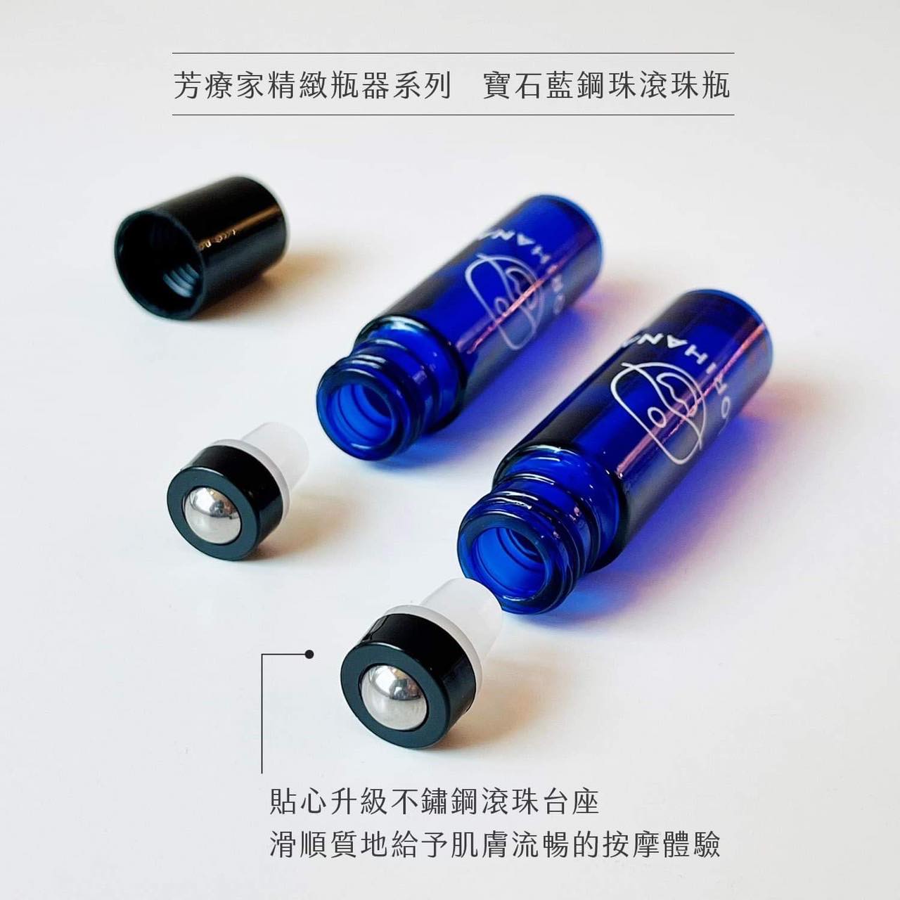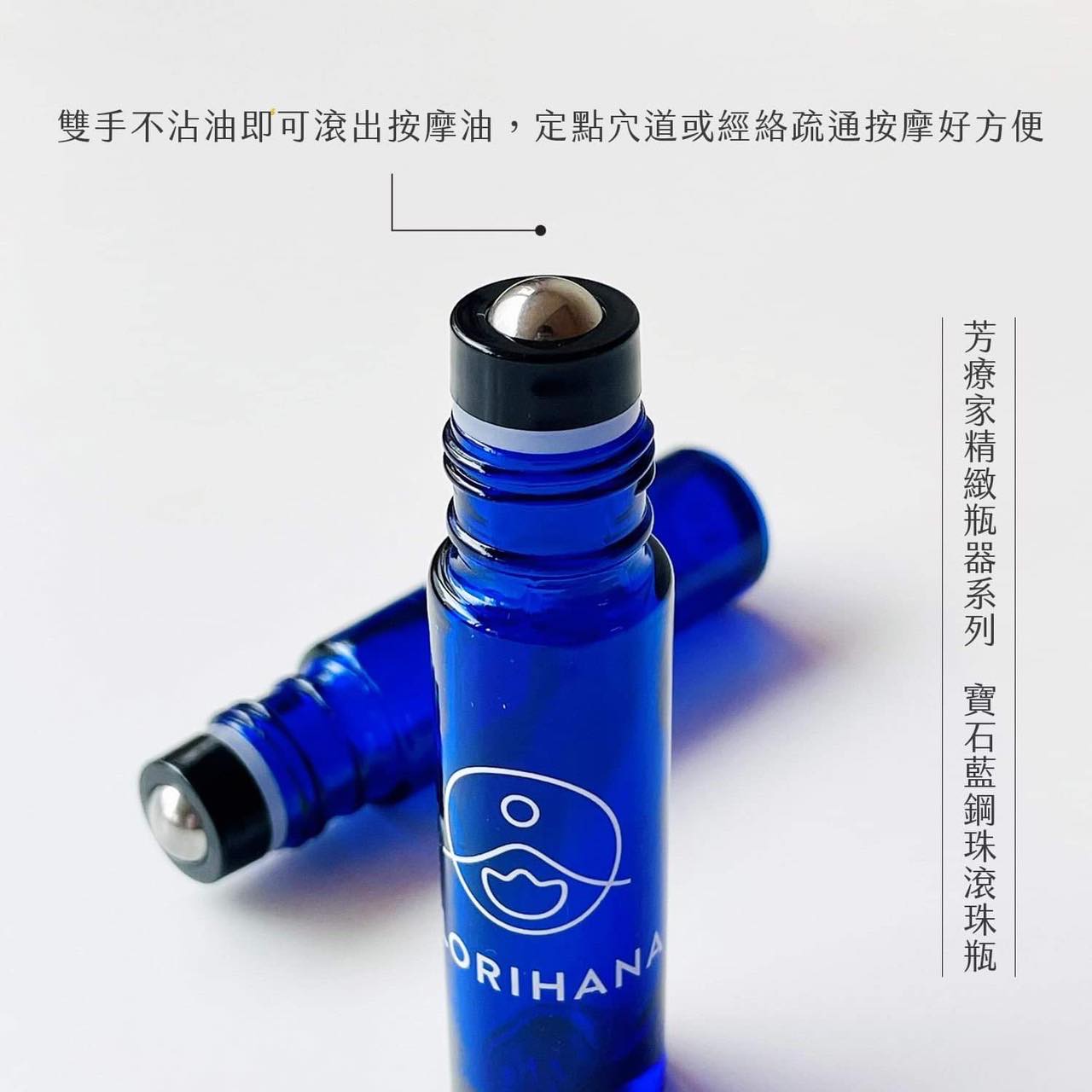 常用來承裝按摩油,10毫升的滾珠瓶裡加入10滴精油,再填滿植物油,即是精油濃度5%的身體按摩油。