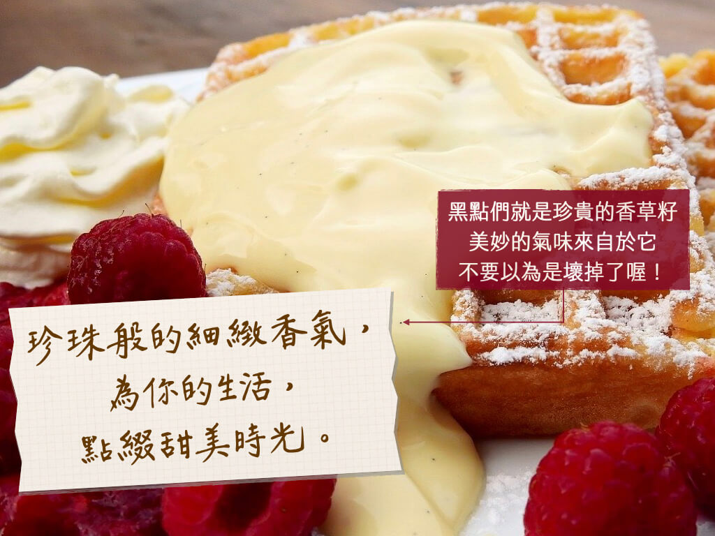 市售的香草產品有很多類型,原型的香草莢、香草精、香草粉或膏,可以在各大食品或者烘焙材料行購買到。Florihana的香草脂以有機酒精萃取出香草香氣分子,質地黏稠,為便利使用,與25%有機酒精混合為液體,並裝在植物油滴頭規格的瓶中,因此瓶蓋是白色的,以做區隔。使用時請給予這個美妙香氣一點時間,讓它緩緩滴出。